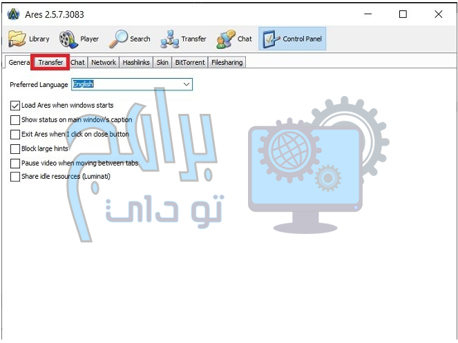 بعد ذلك ، افتح قسم النقل. تعرض علامة التبويب هذه جميع خيارات تنزيل Ares´.