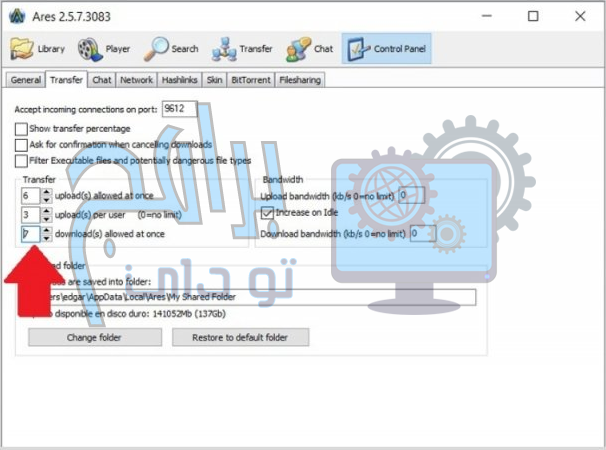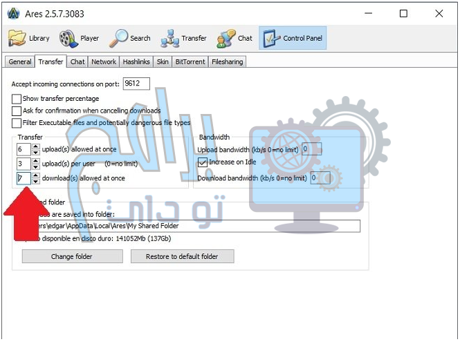 سيسمح لك تعيين هذه القيمة بشكل صحيح بالحد من استخدام النطاق الترددي الذي يستخدمه برنامج Ares للعمل. لا تنس أنه بالإضافة إلى ذلك ، لديك خيارات أخرى ستساعدك على معايرة تأثيرها على اتصالك. على سبيل المثال ، في قسم النطاق الترددي ، يمكنك تعيين حد أقصى للسرعة. أو ، مع السماح بخيار التحميل (التحميلات) مرة واحدة ، ستحدد عدد التحميلات المتزامنة التي يمكن أن يؤديها Ares.
