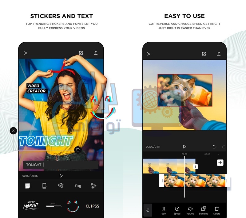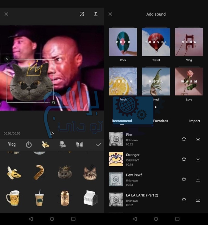 - يستطيع المستخدم إضافة الملصقات للفيديو وكذلك الخطوط المختلفة من أجل رفع مستوى الجمال والتوضيح معًا.