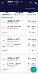 - بعد الضغط على بحث في تطبيق سكاي سكانر او الموقع ايضا تبدأ نتائج البحث في الظهور أمامك في مدة 30 ثانية ، وتكون مرتبة من الأقل سعرا إلى الأعلى سعرا.