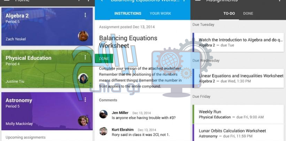 كما يتيح لك البرنامج إمكانية مشاركة التعليقات والإطلاع على الدروس مع المعلم و يمكنك أيضاً حل الواجب المدرسي على جوجل كلاس روم فستجد جميع الواجبات التي قام بوضعها المعلم مع موعد تسليمها وسوف تظهر كافة البيانات المتعلقة وعند الإنتهاء من الواجب يمكنك إرساله للمعلم من خلال الضغط على زر إنشاء ورفع الواجب لتسهيل العملية التعليمية وتلقي المعلومة العلمية حيث ينقسم برنامج كلاس روم إلى ثلاث أقسام وهما ساحة المشاركة، الواجب المدرسي، الأشخاص.