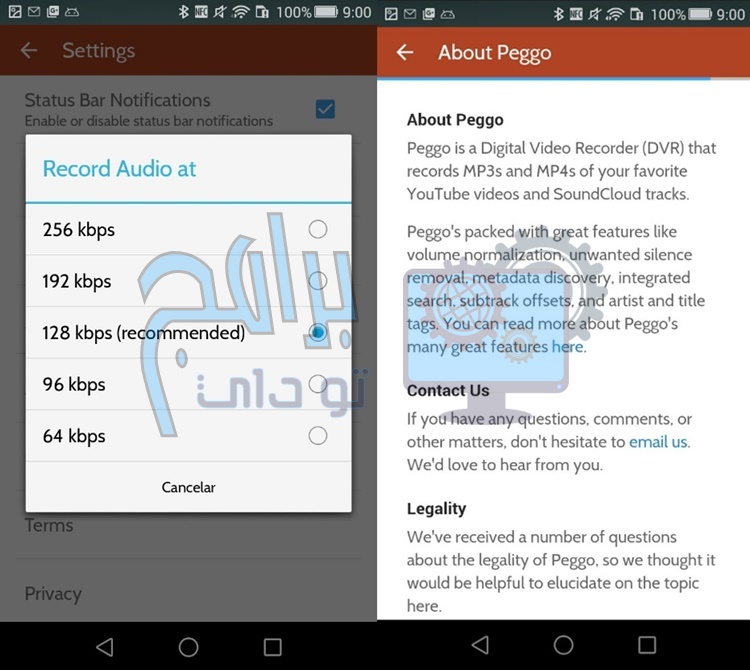 برنامج peggo من أفضل البرامج التي يمكنك تحميلها على هاتفك المحمول حيث يتيح لك البرنامج إمكانية تسجيل الملفات الصوتية من خلال فيديوهات اليوتيوب بصيغة ،mp3 وتحويل مقاطع الفيديو إلى مقاطع صوت، وكذلك أيضاً على برنامج الساوند كلاود ويمكنك أيضاً تقطيع الأغاني وإزالة المقاطع غير المحببة من الأغاني.