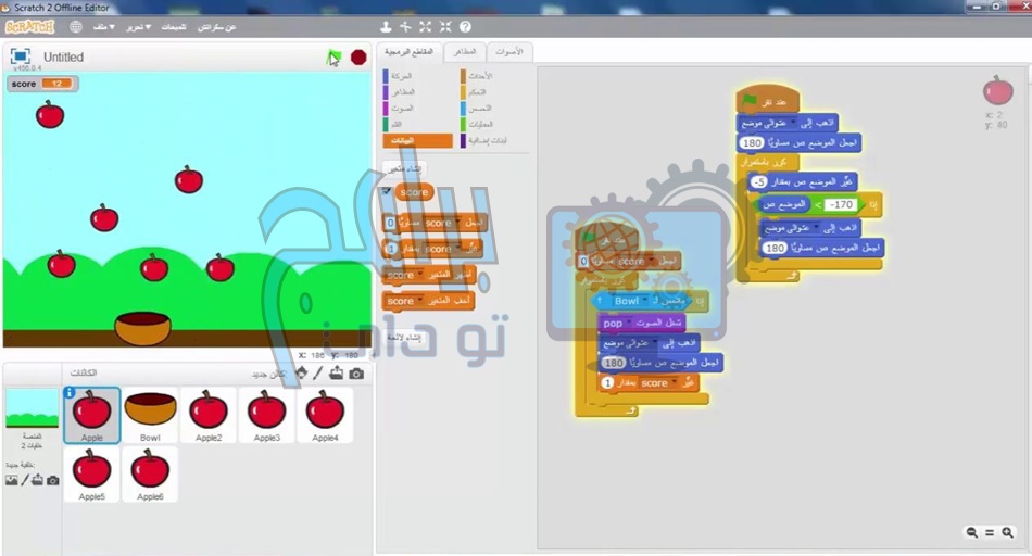 - لتنفيذ المشروع بإستخدام الحدث اضغط على رمز العلم ولإيقاف المشروع ، قم بالضغط على رمز الكرة الحمراء.