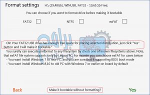 بعد تحديد توزيعات الويندوز ، بالنقر فوق “التالي” ، يمكنك الاختيار بين أنظمة الملفات FAT32 أو NTFS أو exFAT. قم بإنشاء محرك أقراص USB قابل للتمهيد بسهولة دون مسح محتوياته بالطبع ، يستهدف برنامج WinUSB في الغالب المستخدمين الذين يرغبون في الحفاظ على البيانات المخزنة على محركات الأقراص الخاصة بهم سليمة ،