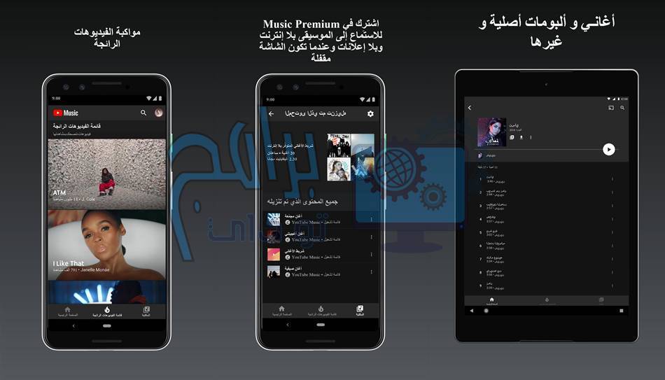 بالاضافة إلى إتاحة التواصل مع الفنّانين المفضّلين لديك، ويمكنك من العثور على العديد من الفيديوهات الموسيقية الجديدة للاستماع إليها على كل الأجهزة الموجودة لديك ومع كل أنظمة التشغيل المختلفة، حيث يمكنك مشاهِدة محتوى YouTube بلا إعلانات من أيّ جهاز محمول أوجهاز كمبيوتر أو تلفزيون لتسجّل الدخول منه.