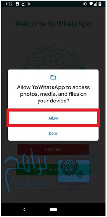 - سيطلب منك YOWhatsApp منح أذونات للوصول إلى الصور وملفات الوسائط المتعددة والملفات الأخرى على هاتفك. اضغط على السماح.