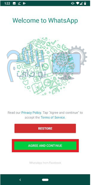 - ستصل إلى شاشة تطبيق يو واتساب YOWhatsApp الأولى ، على غرار شاشة أي عميل آخر. اضغط موافق ومتابعة لقبول شروط وأحكام الاستخدام.